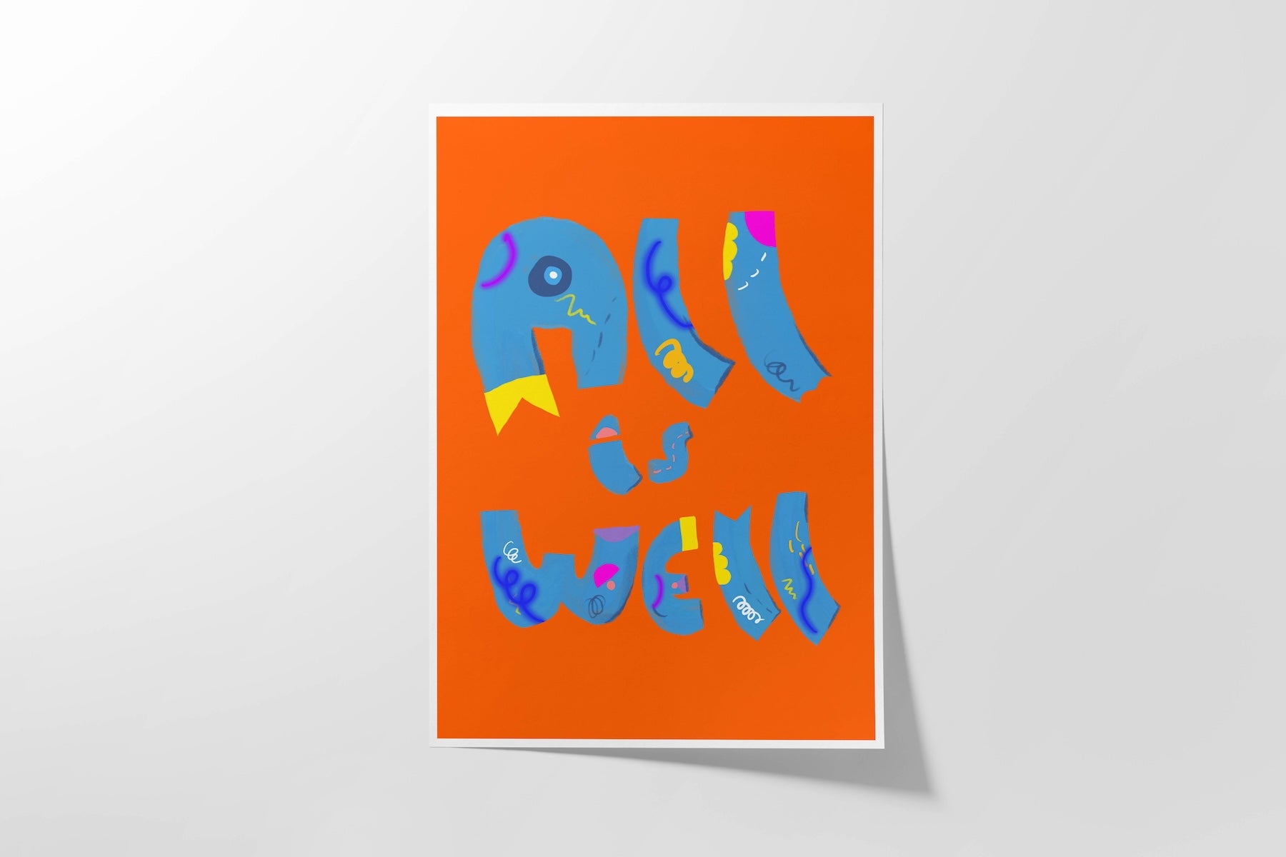 Brighten your walls with this bold “All is Well” art print. A daily reminder to trust that everything will be okay. Featuring playful blue hand-lettering on a vivid orange background.