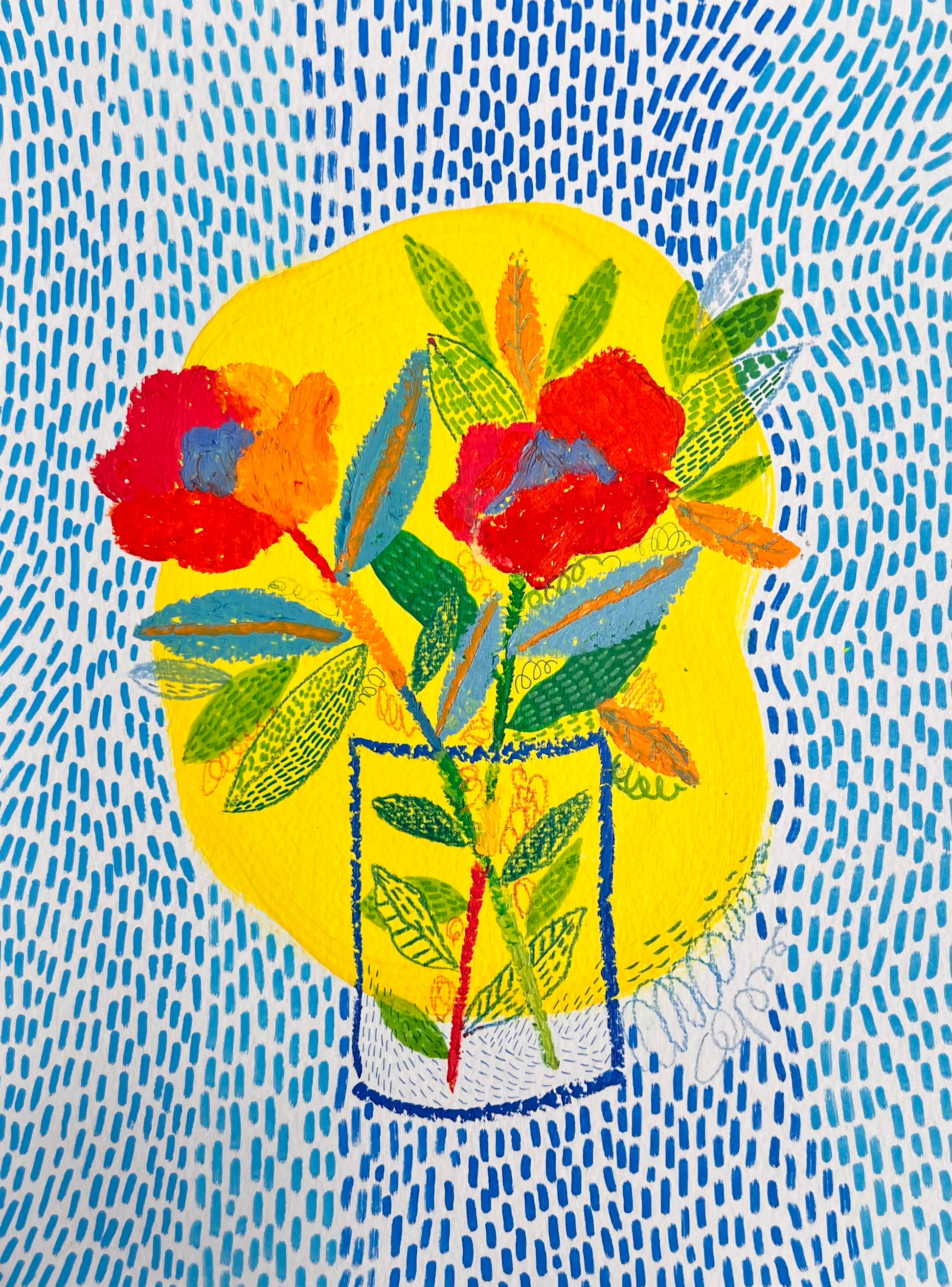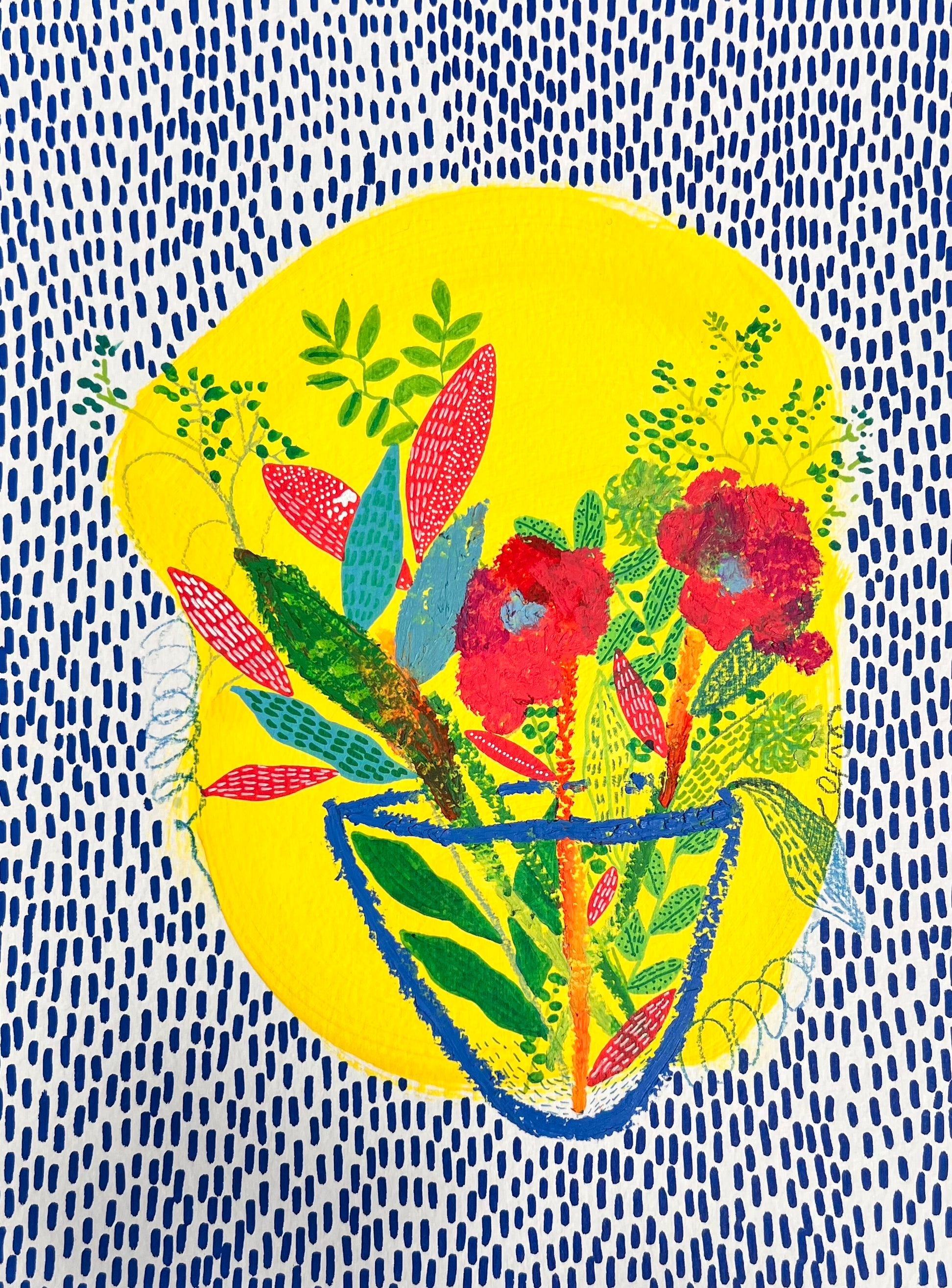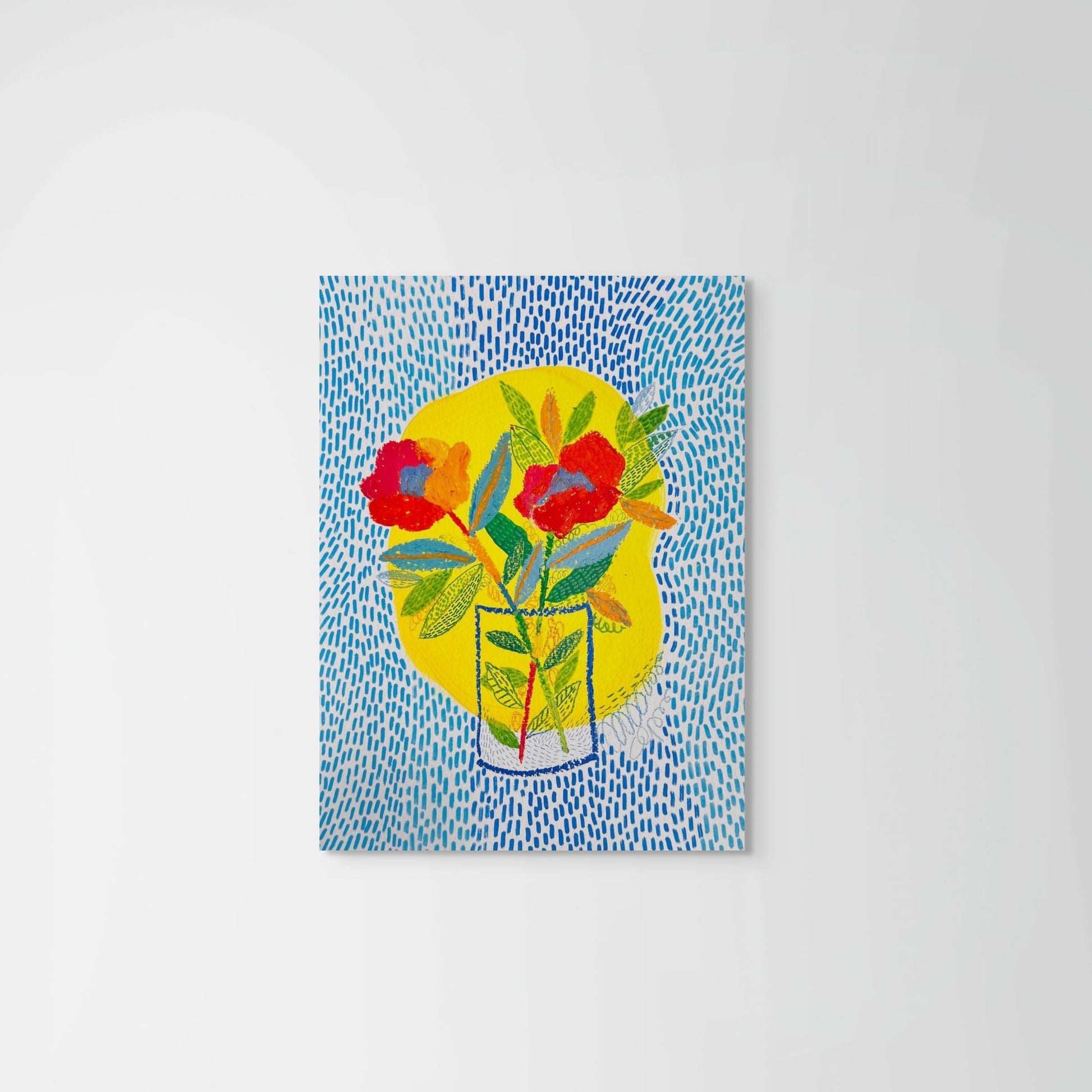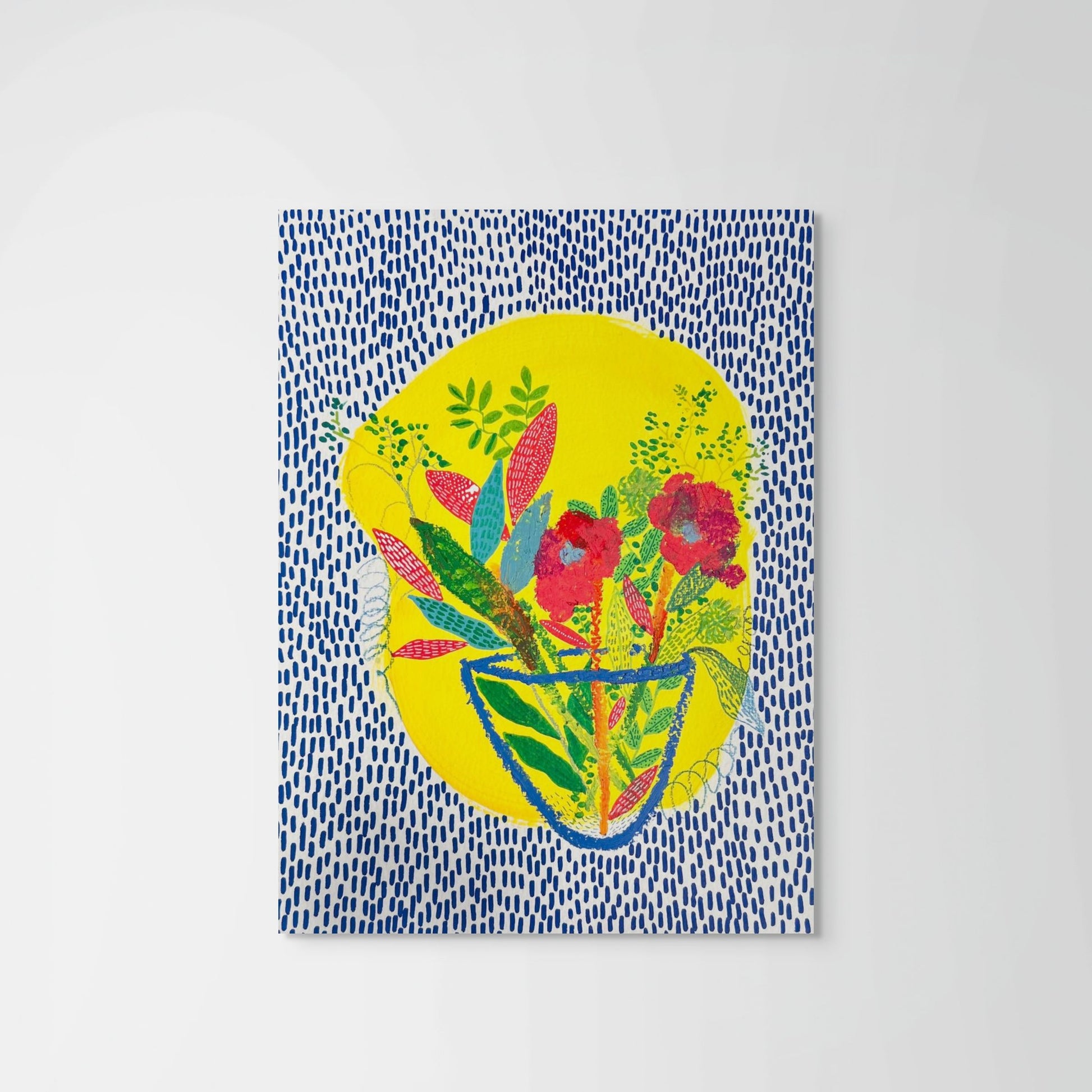 Bring a burst of color, joy, and optimism into your space with this set of 2 vibrant flower art prints. Each piece tells its own story of resilience and beauty: bold red blossoms rise from patterned vases, surrounded by lush leaves and grounded in a sea of energetic blue. The sunshine-yellow background glows like a halo, reminding us that even the smallest vase of flowers can light up an entire room.