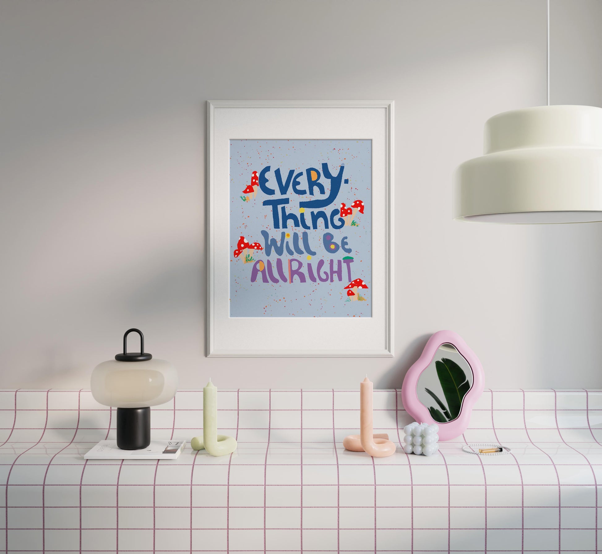 Add a daily dose of optimism to your space with this colorful and comforting print that reminds us: Everything Will Be Alright. Featuring playful hand-lettering, cheerful mushrooms, and joyful speckles on a sky-blue background, this piece is a gentle pep talk in print form.
