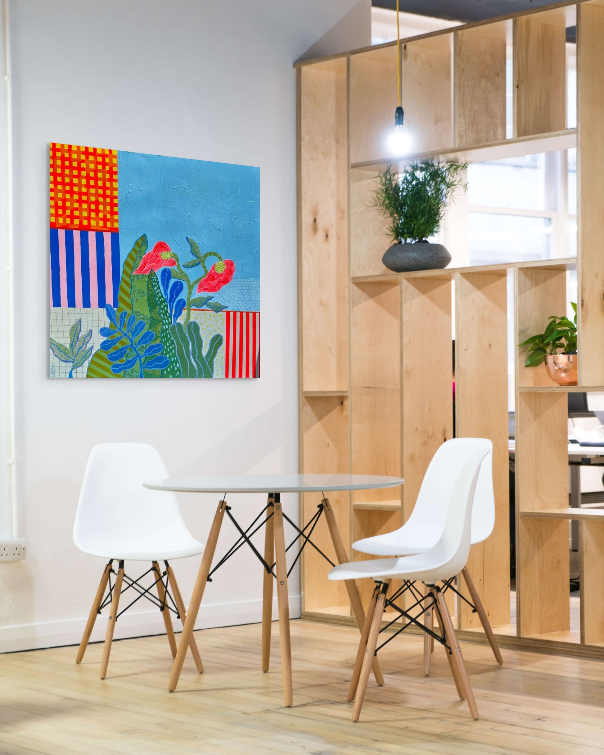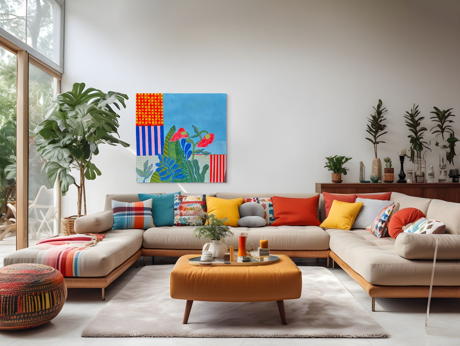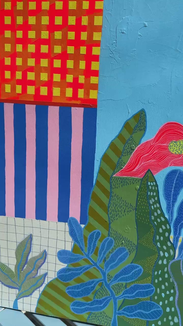 Garden Grid is a 36x36 inch original mixed media artwork on canvas—an abstract botanical composition that blends vibrant pattern and layered organic form. Featuring red checkers, sky blue lines, and stylized greenery, this one-of-a-kind piece is ideal for collectors of modern wall art with a graphic twist.