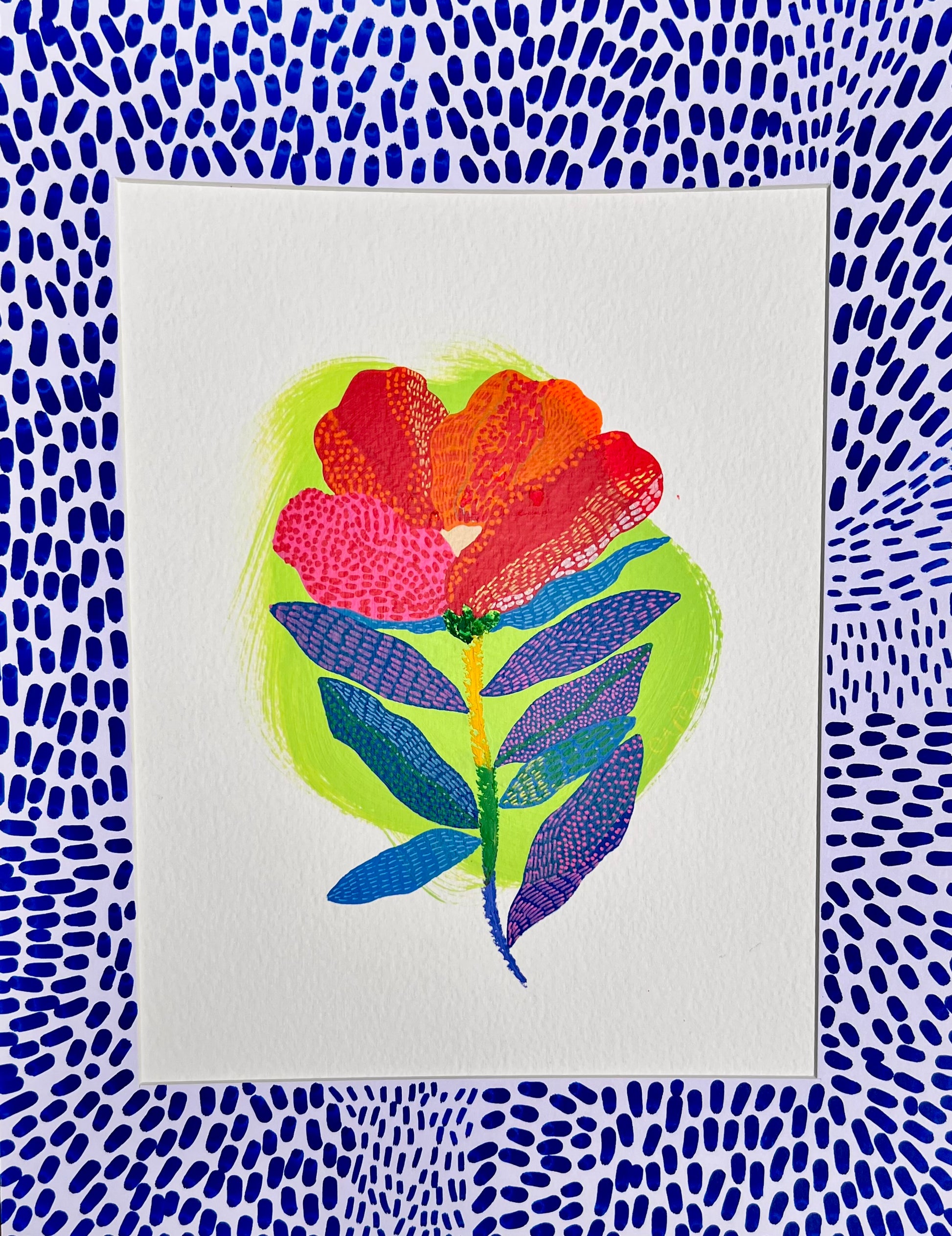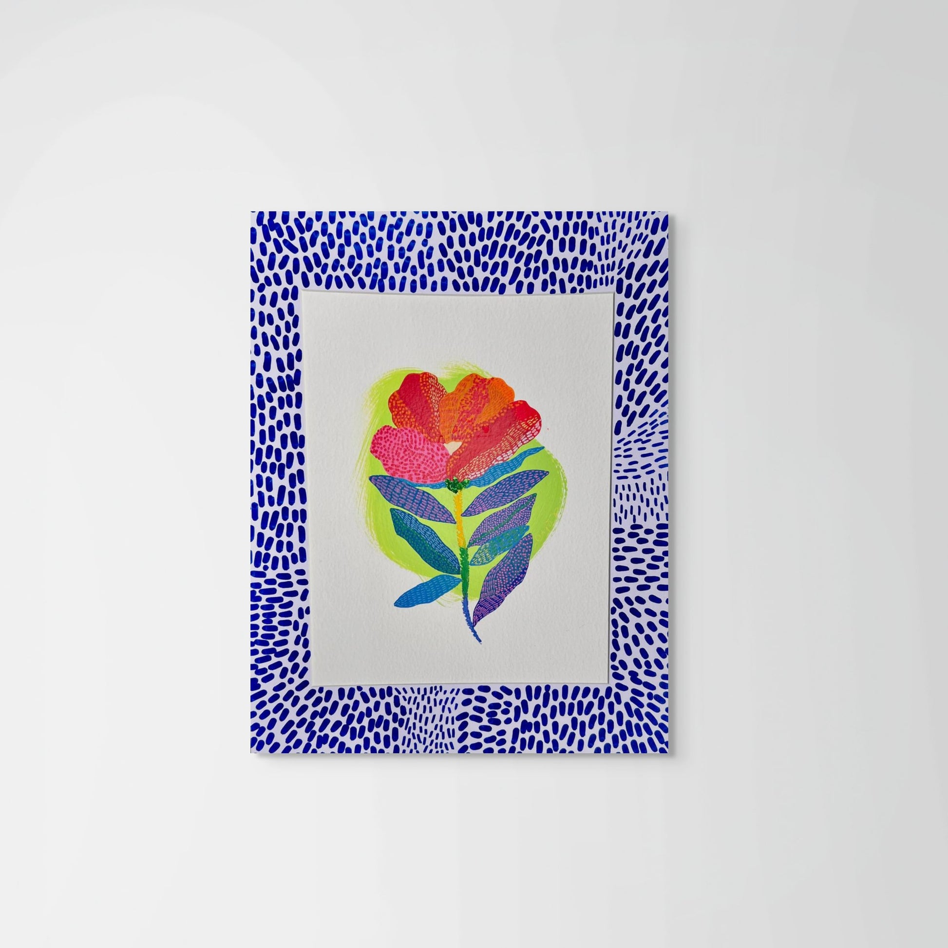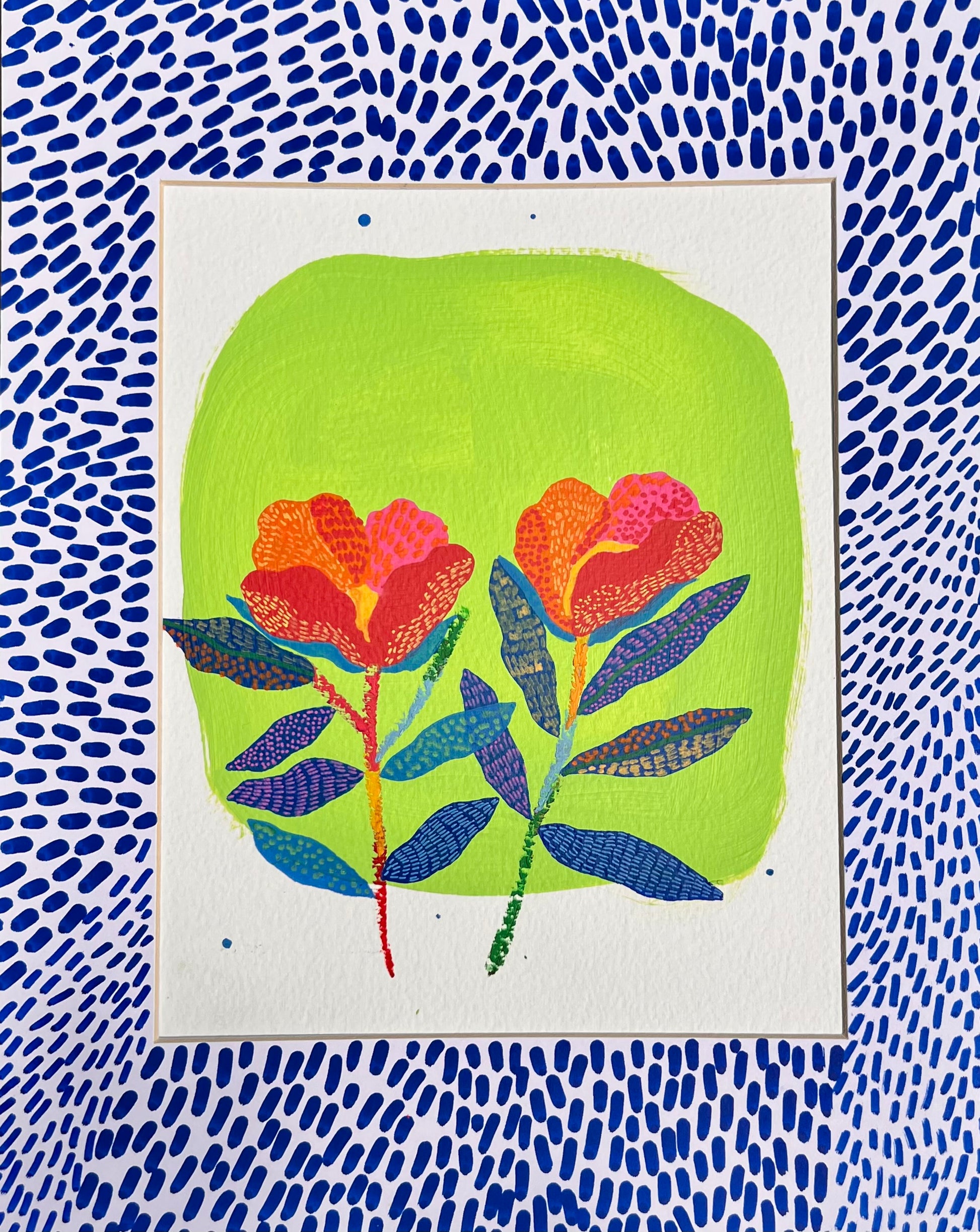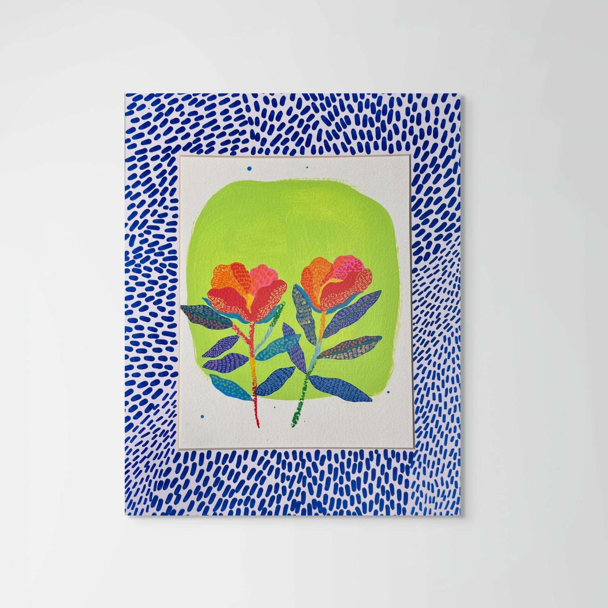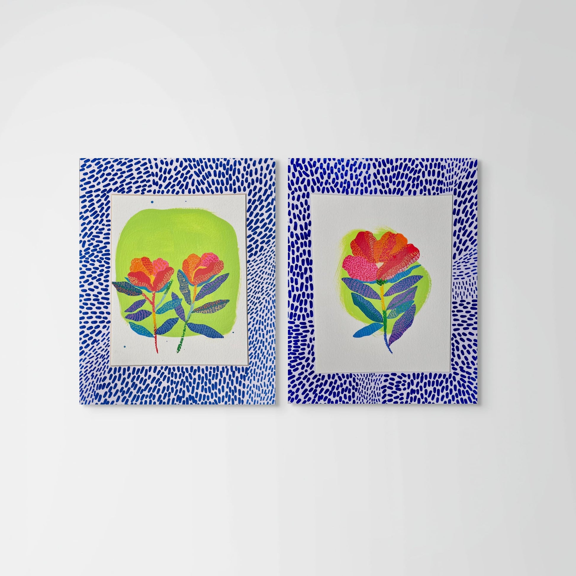 Light up your walls with Glow Bloom, a set of 2 original mixed media flower artworks on paper. Each piece bursts with energy: bold red blossoms and indigo leaves rise from a radiant neon-green backdrop, framed by rhythmic cobalt-blue brushstrokes. The result is both vibrant and grounding—like a garden glowing under summer skies.