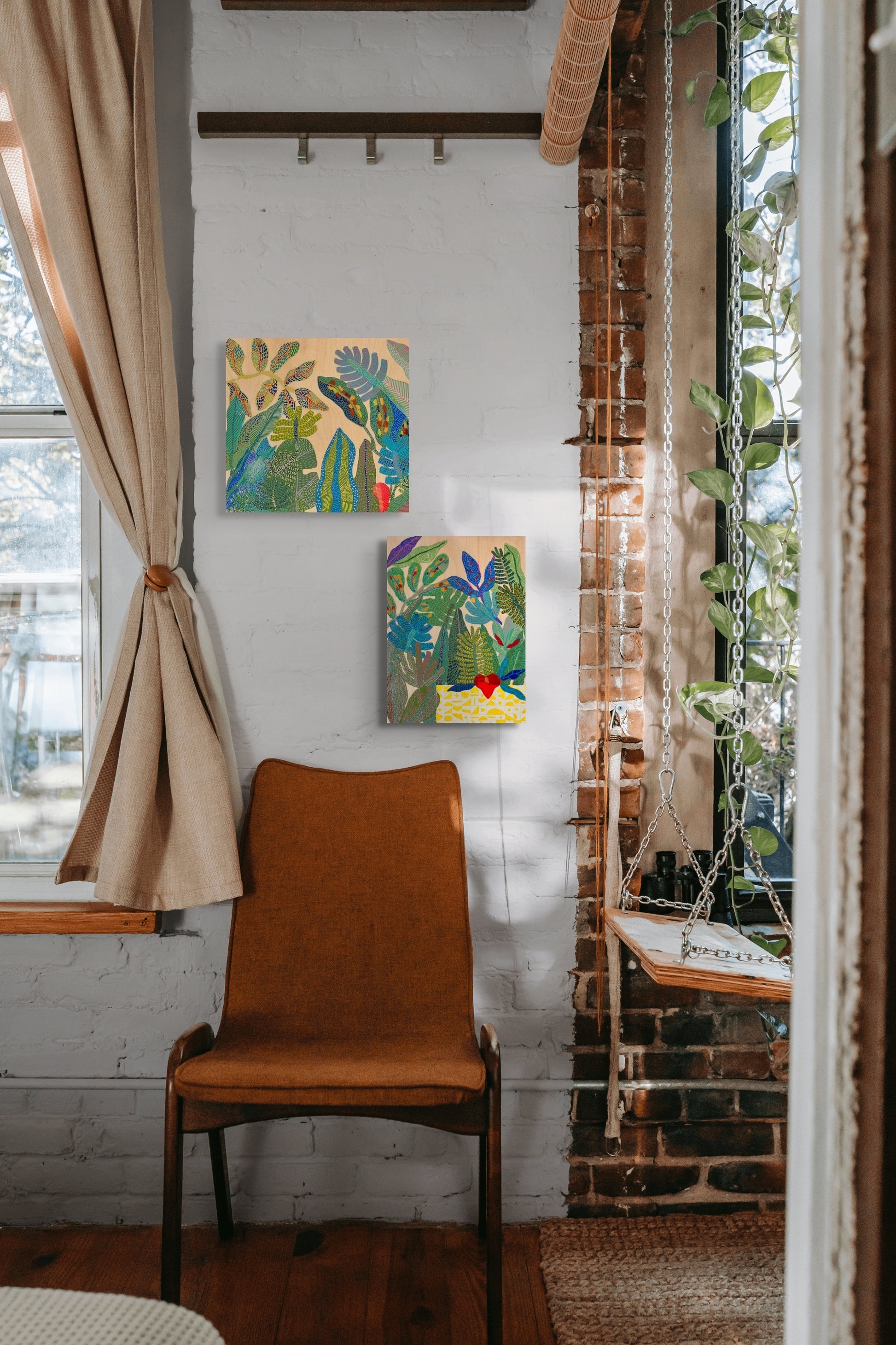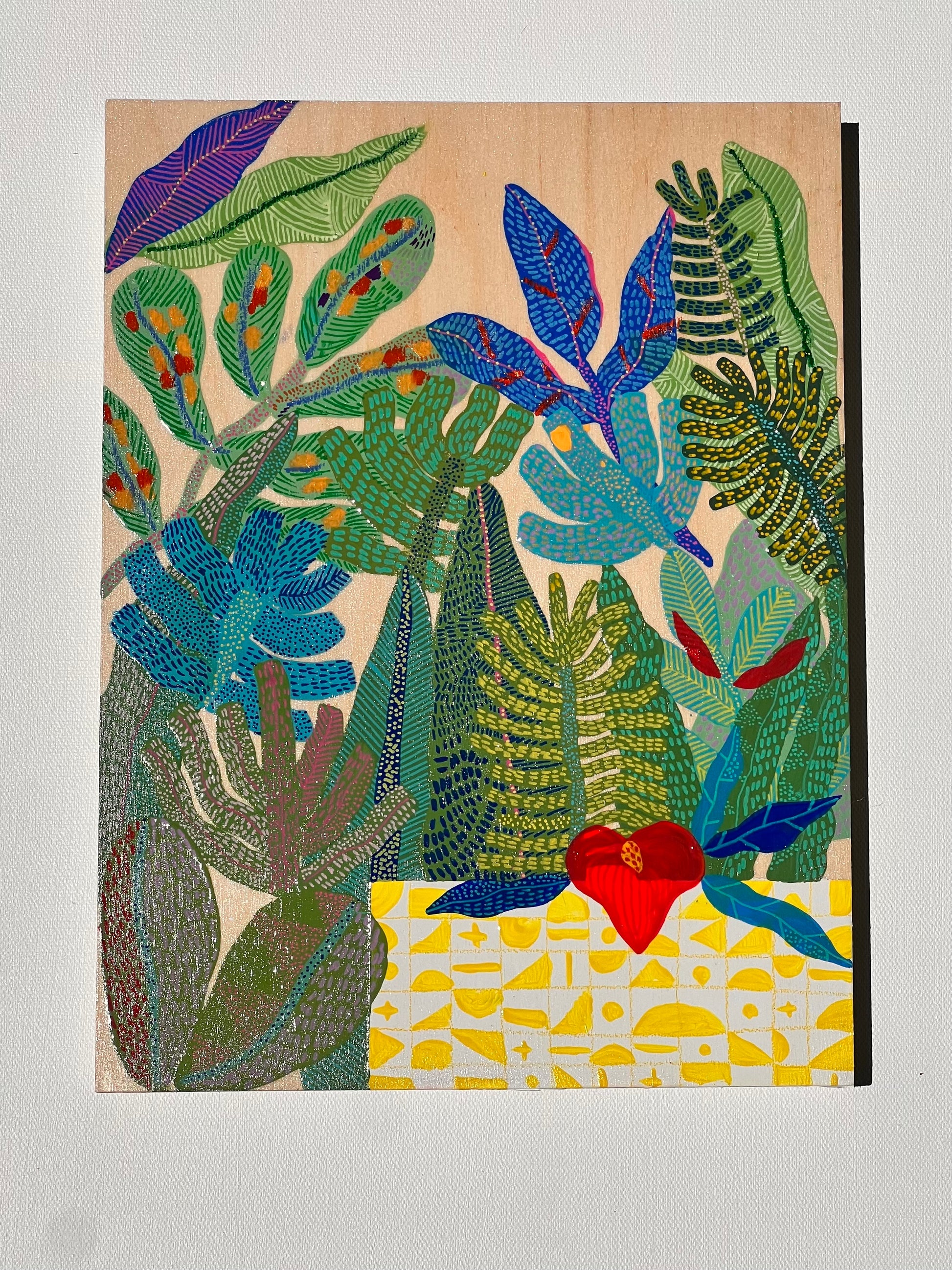 “Jungle Still Life” is a lush celebration of color, texture, and natural rhythm—an original 9x12 inch mixed media painting on wood panel that bursts with botanical brilliance. This one-of-a-kind artwork layers hand-painted tropical leaves, geometric patterns, and a striking red flower over the raw warmth of wood grain for a composition that feels both organic and modern.
