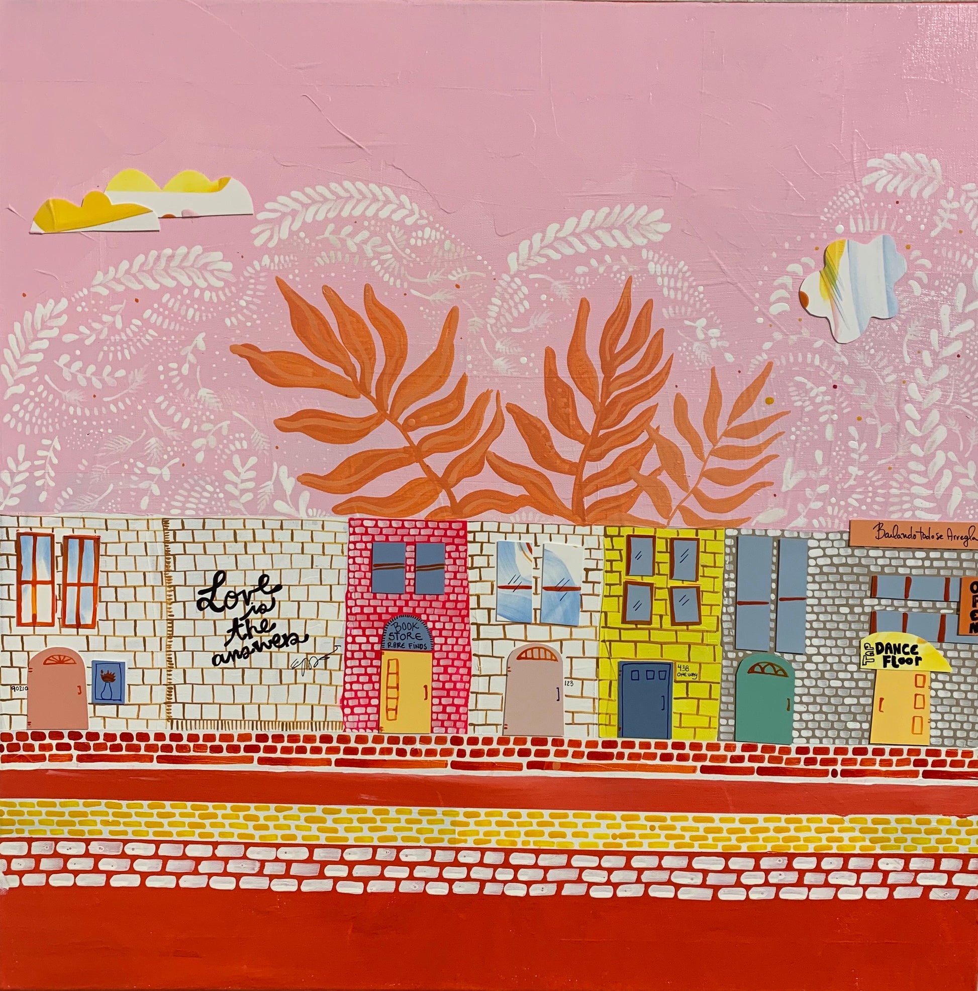 “Love is the answer” is a love letter to small joys, colorful communities, and everyday wonder. This original 24x24 inch mixed media painting on canvas showcases a charming neighborhood scene with hand-detailed storefronts, bright buildings, and textured botanicals blooming in the background.