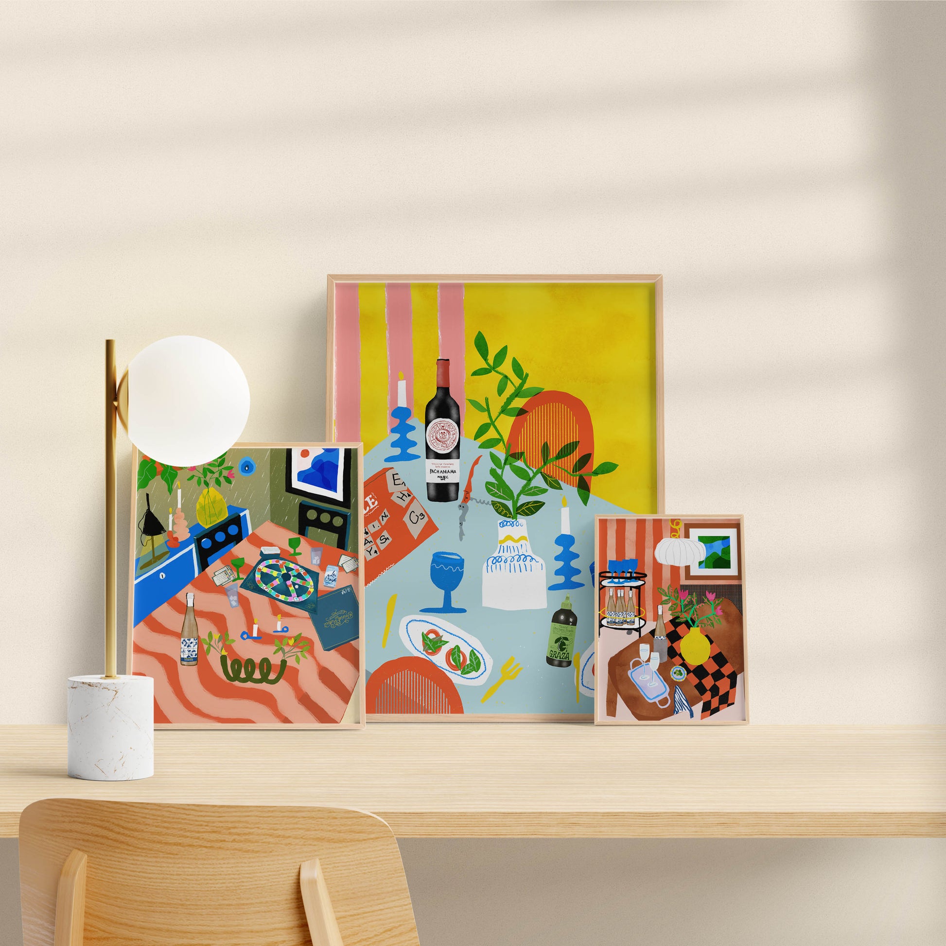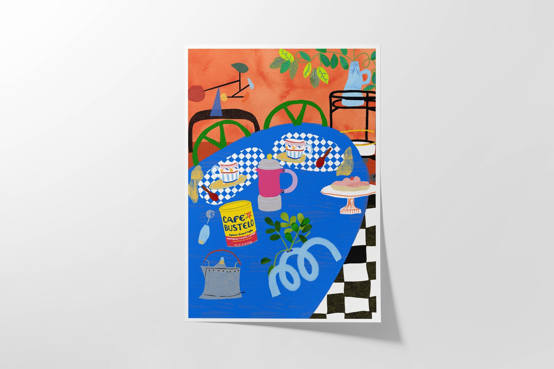 Celebrate the comforting ritual of morning coffee with this colorful and nostalgic illustration featuring a Café Bustelo can, steaming mugs, pastelitos, and checkerboard floors. Set in a warm, plant-filled space, this dopamine decor print radiates joy and cultural flavor—perfect for kitchen walls, coffee nooks, or gallery corners that need a little jolt of personality.