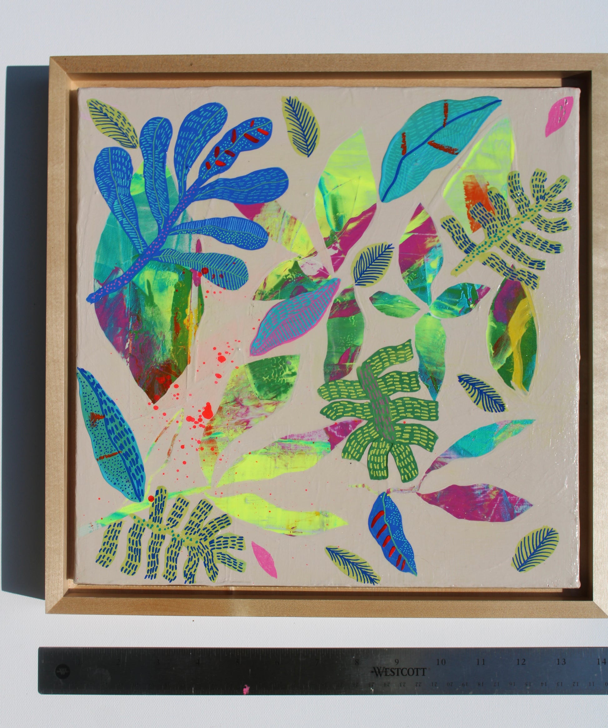 “Neon Tropics” is a vibrant collision of nature and electric color—an original 12x12 inch mixed media painting on canvas that pulses with movement, light, and texture. This one-of-a-kind piece features layered tropical leaves in iridescent neons, saturated blues, and pops of hot pink and crimson. The glossy, glowing foliage appears to shimmer and shift depending on the light, adding dynamic energy to any wall.