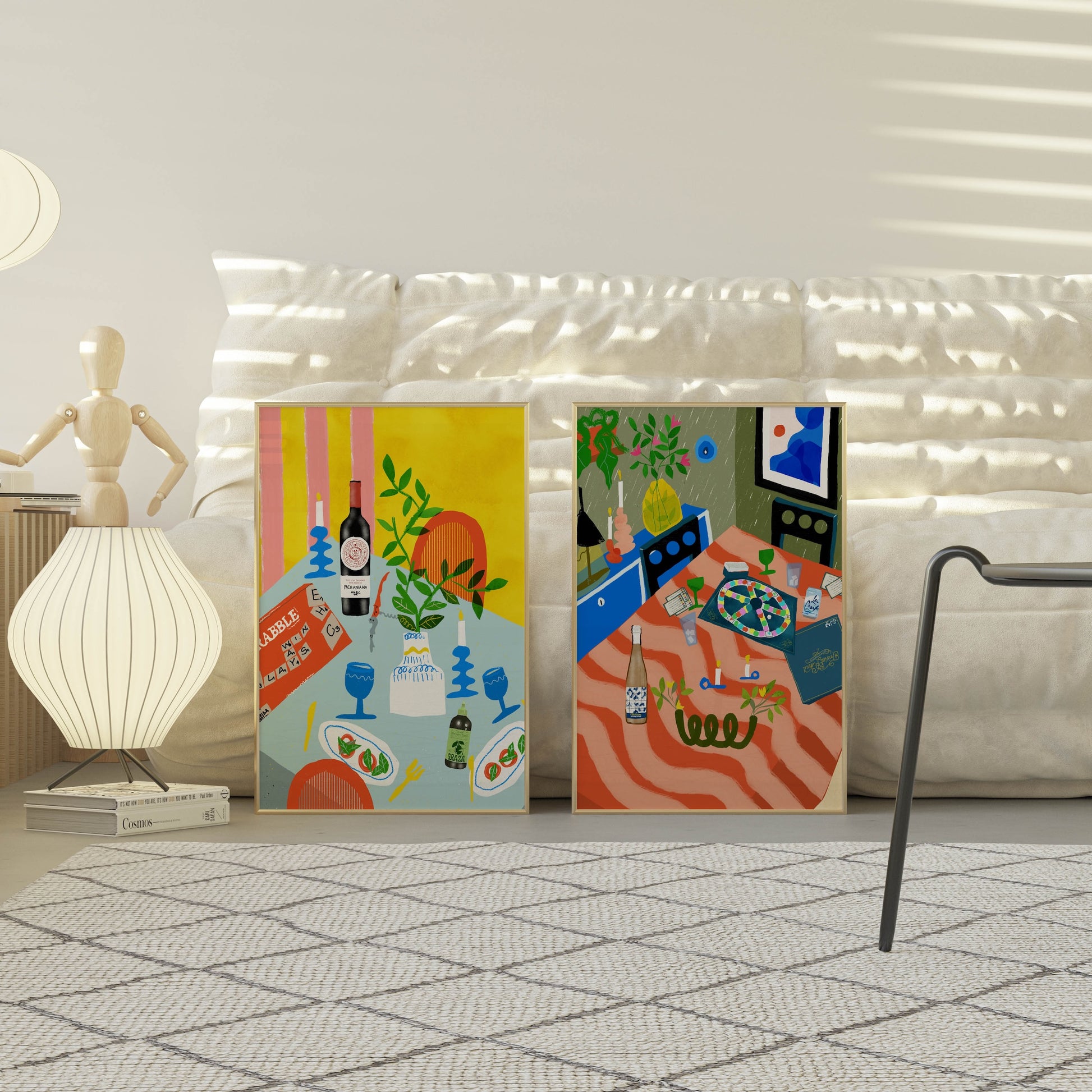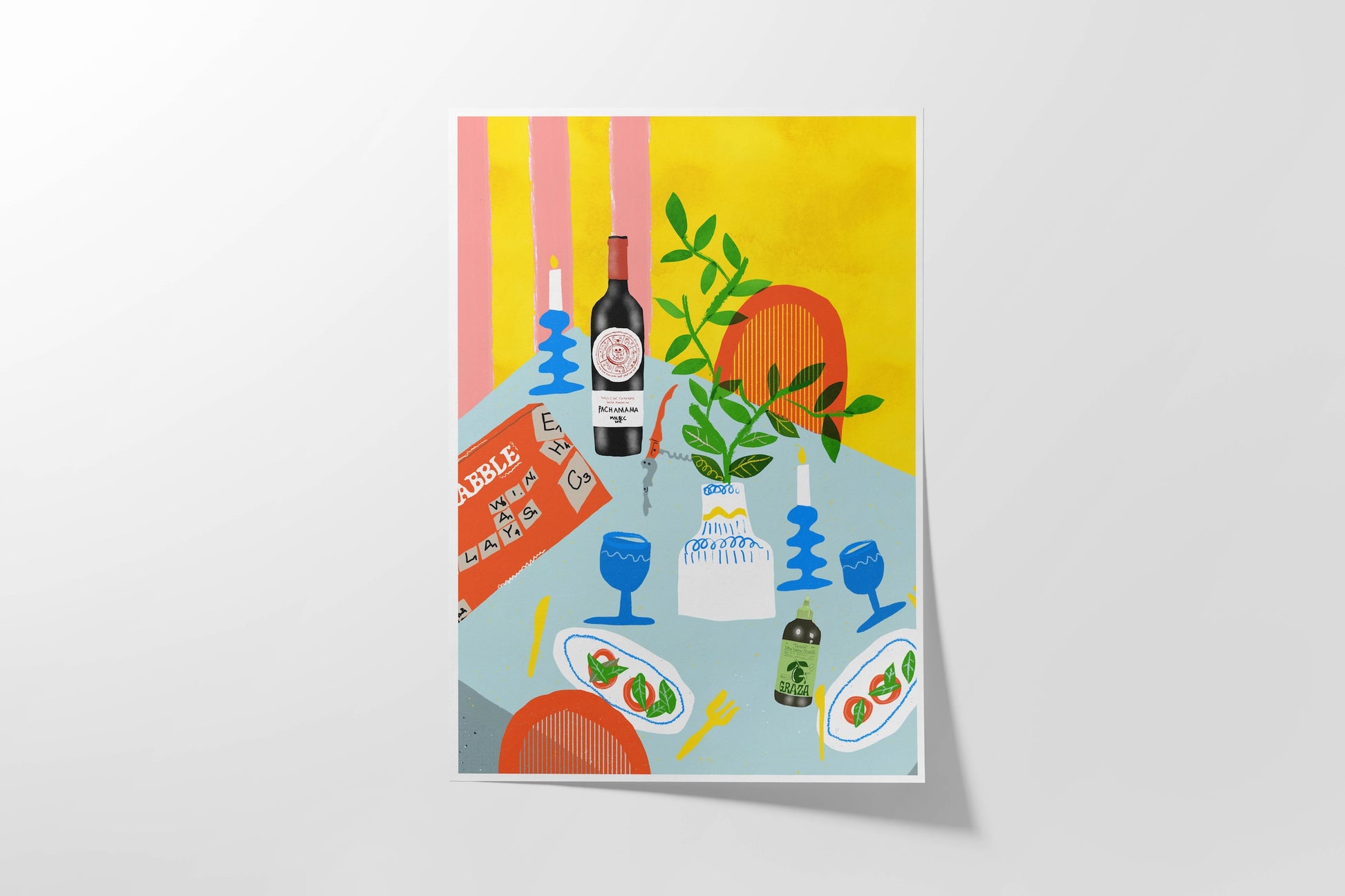 Elevate your space with this vibrant and playful art print capturing the cozy joy of a Scrabble night at home. Set against a bold yellow and pink backdrop, the scene features a bottle of red wine, leafy greens, whimsical candles, and a game mid-play—perfect for fans of board games, dinner parties, and dopamine decor.