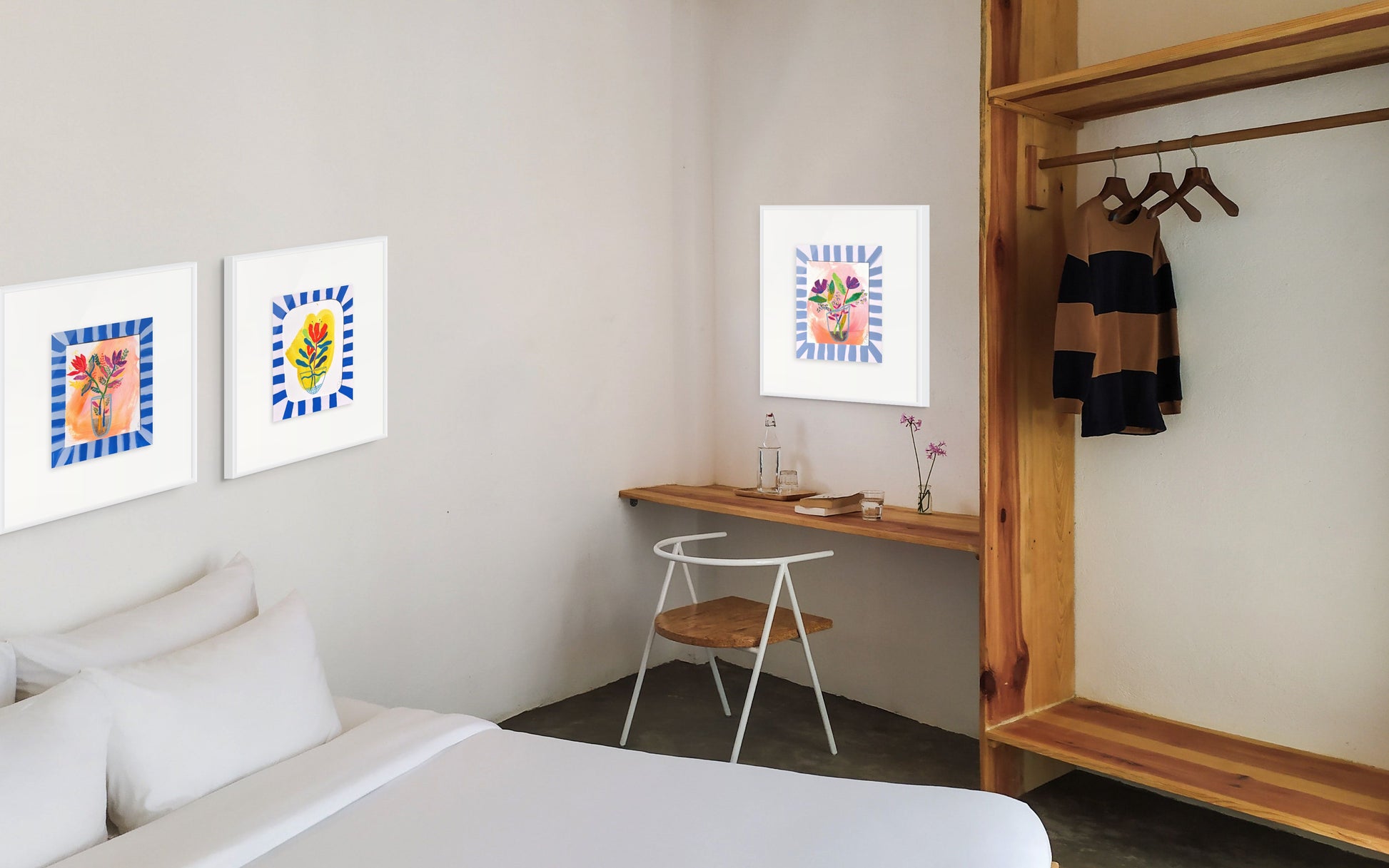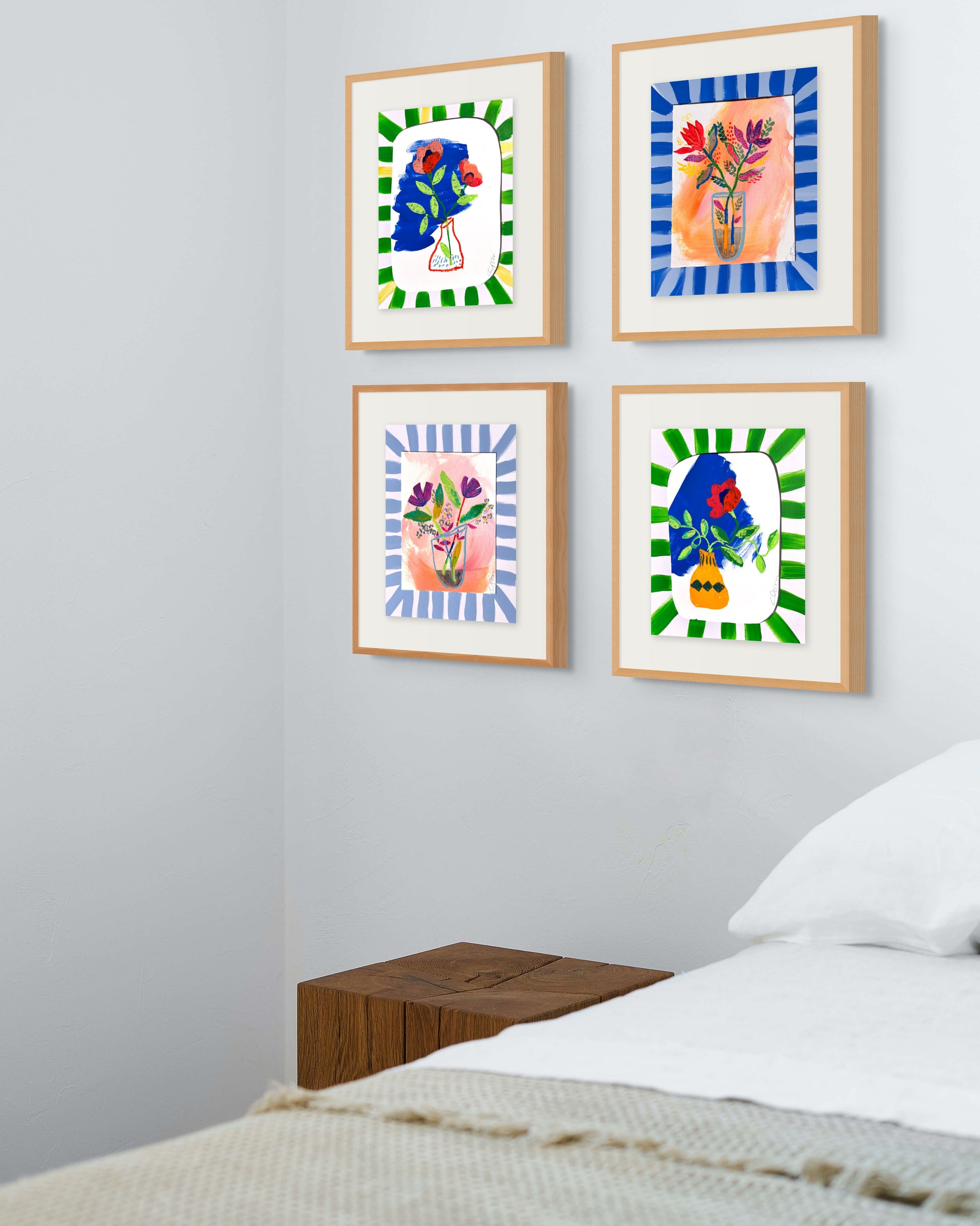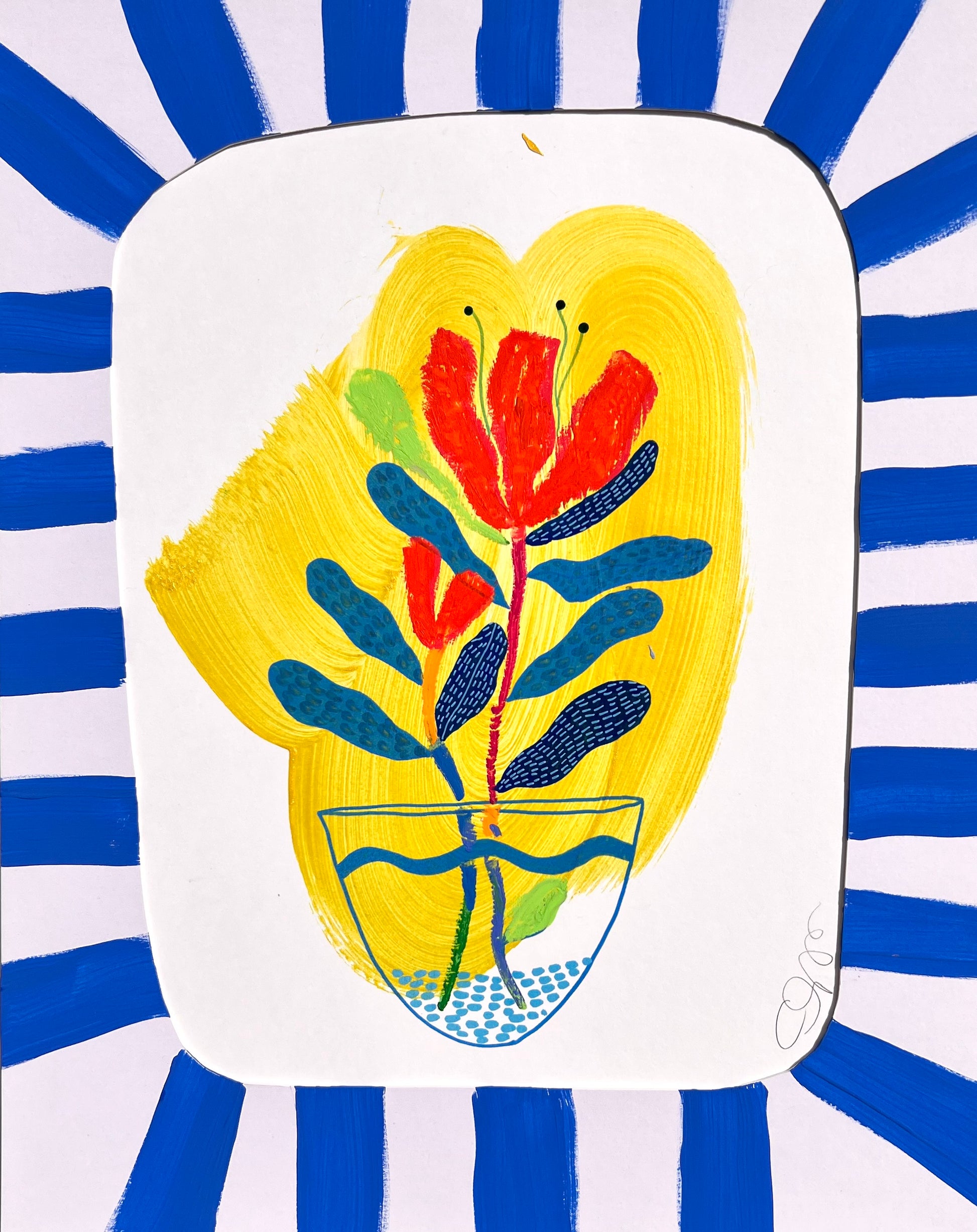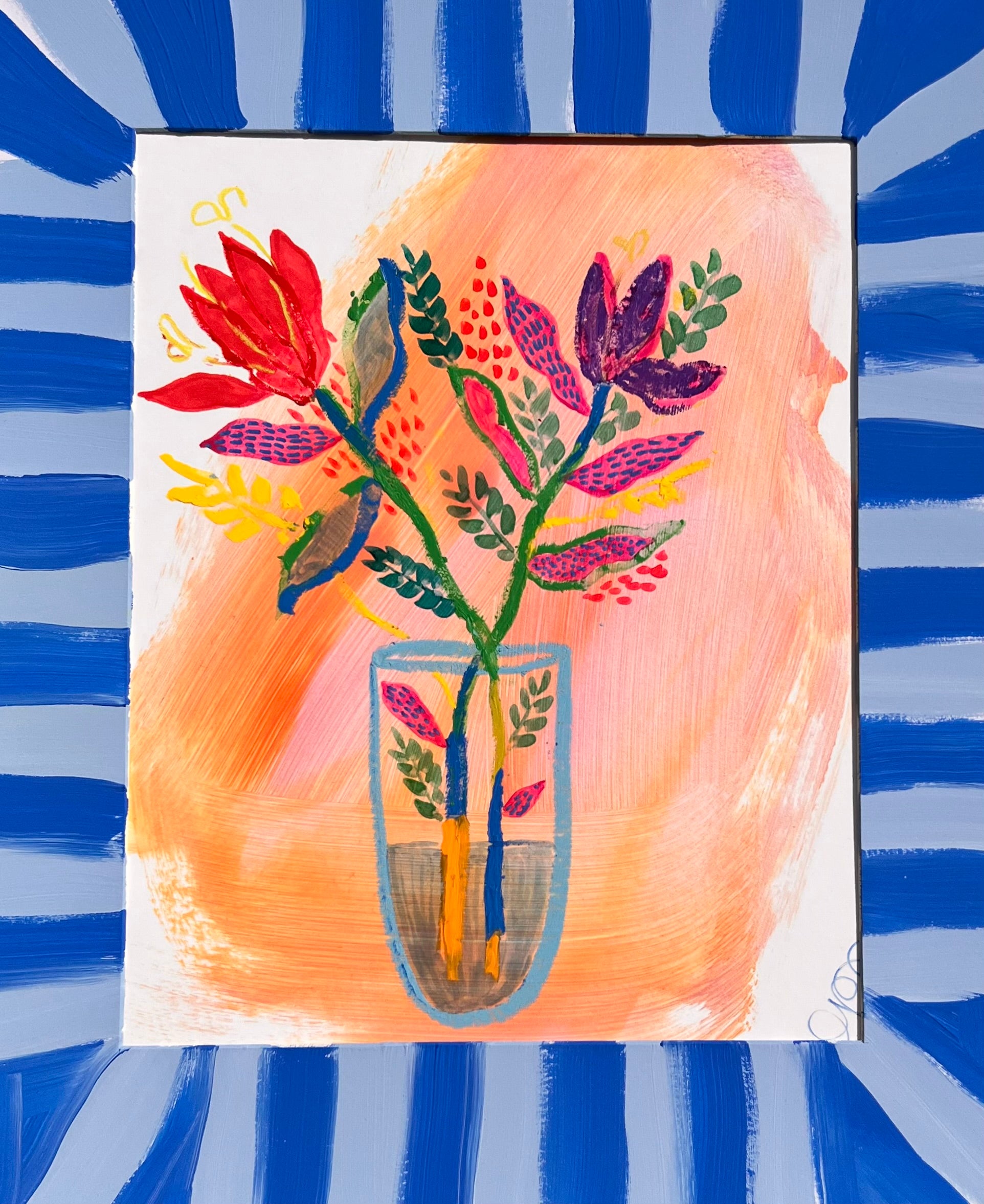 This set of 2 original floral artworks from the Bloom Frames Collection pairs vibrant botanical arrangements with bold hand-painted blue striped mats. Each piece is created with mixed media on paper, combining painterly florals, vivid color palettes, and one-of-a-kind hand-painted details that extend the artwork beyond the page.