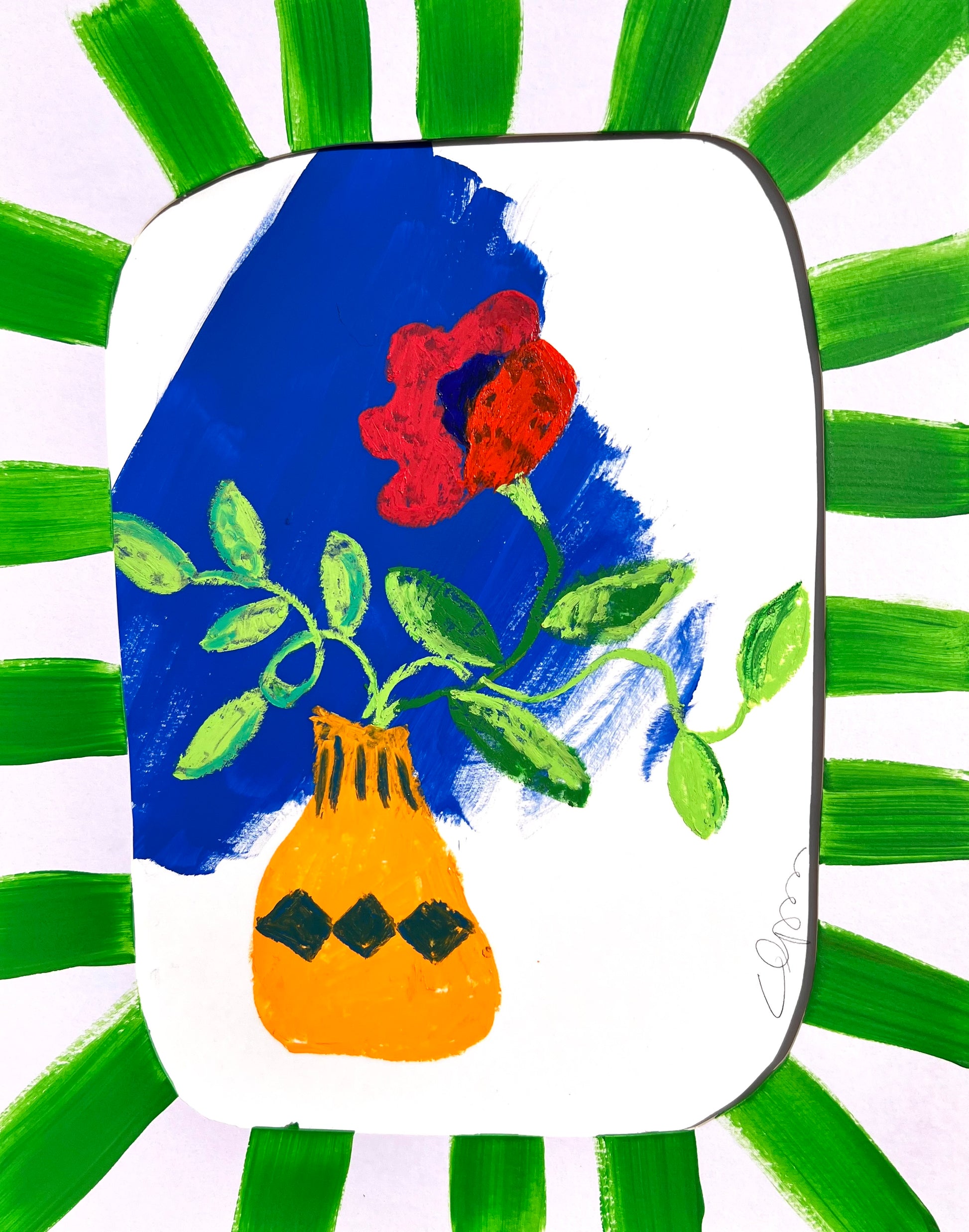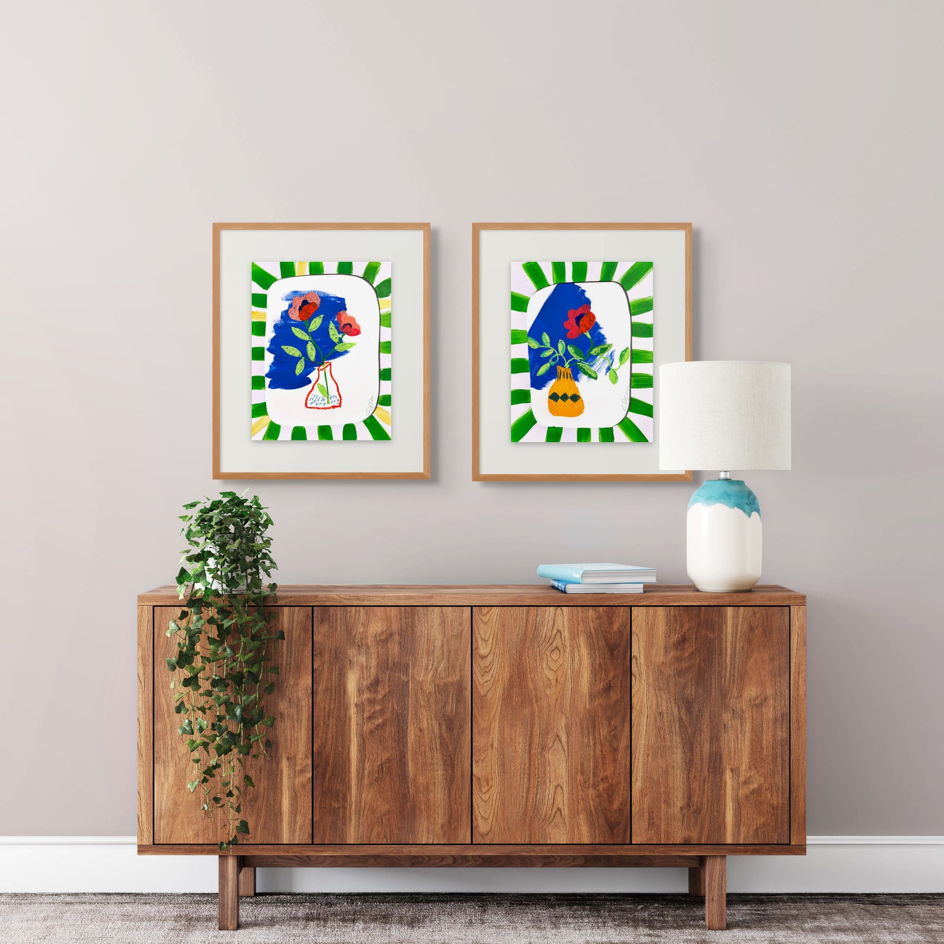 This set of 2 original artworks from the Bloom Frames Collection brings a fresh burst of color and joy to your walls. Each piece is created with mixed media on paper and paired with a bold hand-painted green striped mat, making them one-of-a-kind works of art.