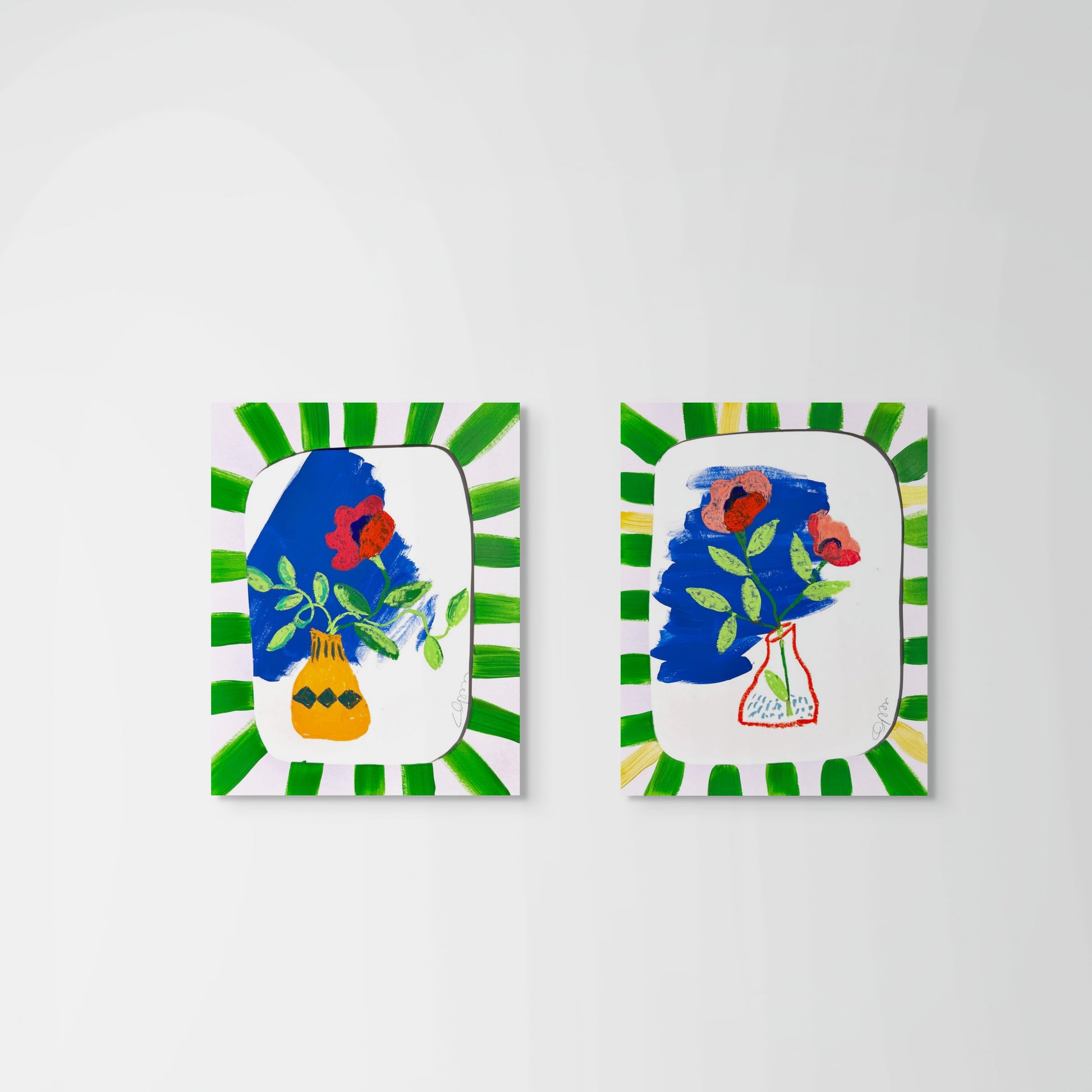Featuring playful floral arrangements in striking vases against deep blue and bright green tones, this duo makes an eye-catching pair for a gallery wall or can be displayed separately to brighten multiple spaces in your home.