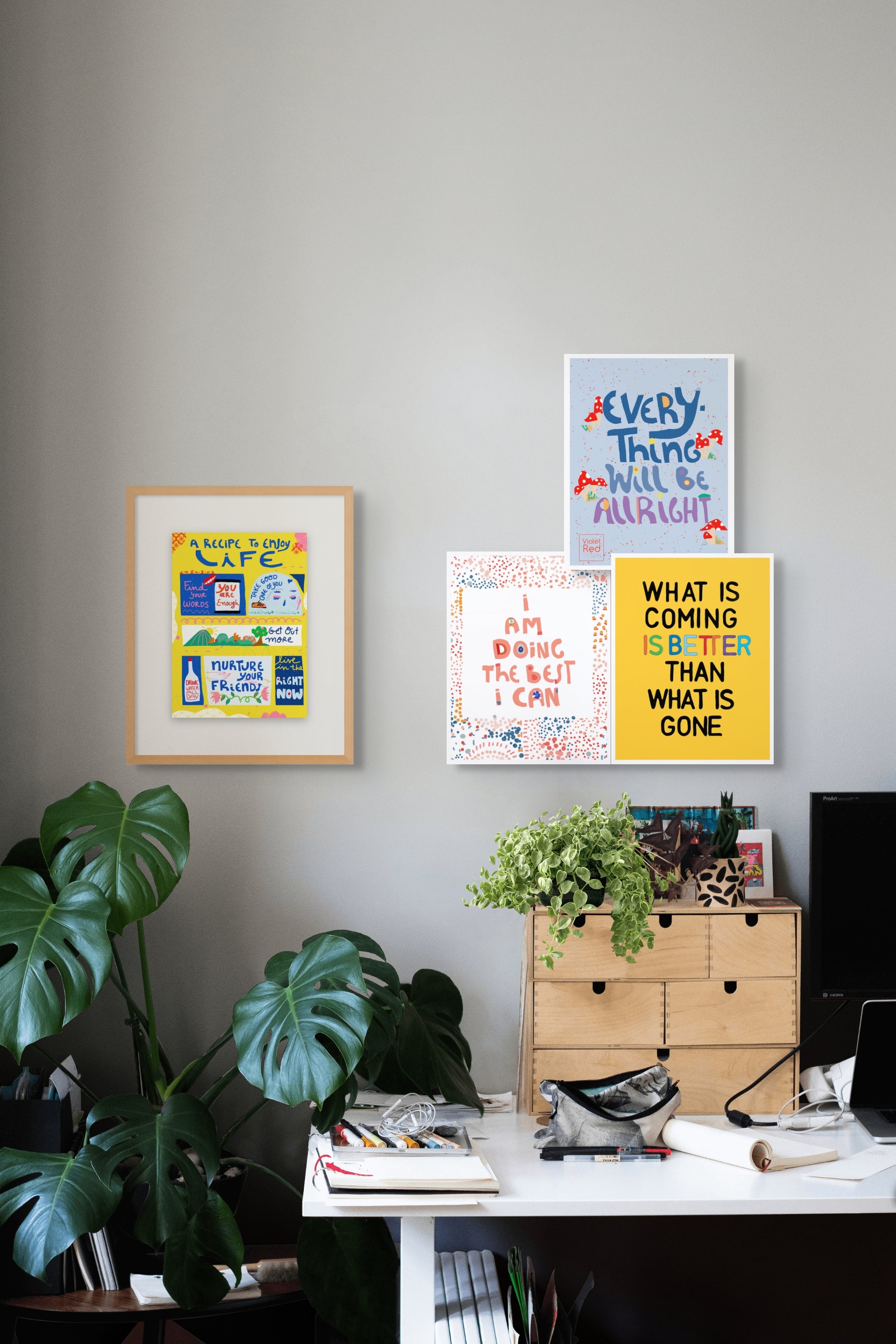 Featuring four uplifting messages — “I Am Doing the Best I Can,” “A Recipe to Enjoy Life,” “What is Coming is Better Than What is Gone,” and “Everything Will Be Alright” — this set makes an inspiring gallery wall, thoughtful gift for a friend, or instant mood-booster for your own room.