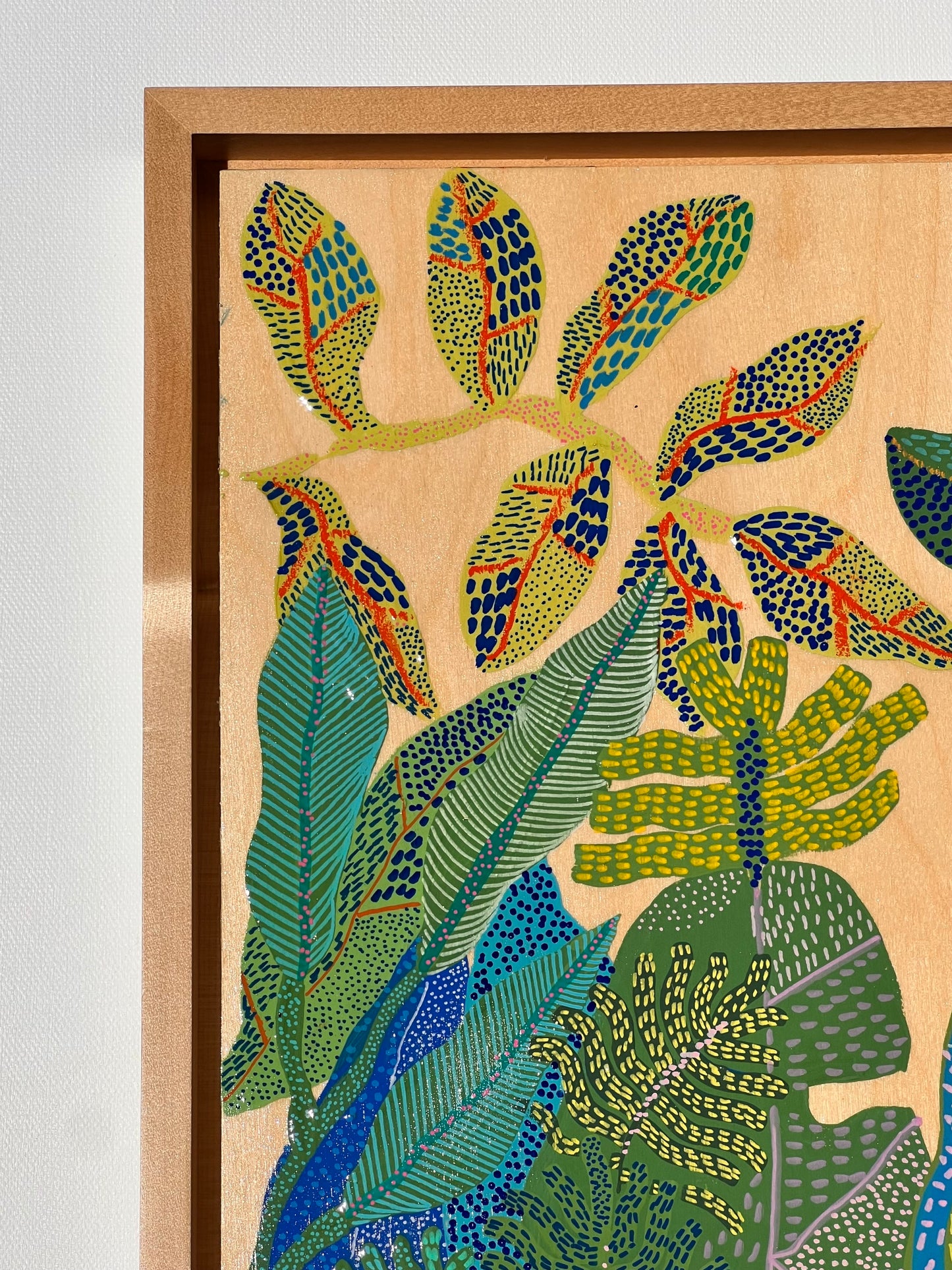 Vivid greens, deep blues, fiery reds, and golden tones are layered in a mesmerizing composition that feels alive with movement and pattern. The exposed wood grain adds organic depth, grounding the vibrant energy of each leaf and botanical shape.