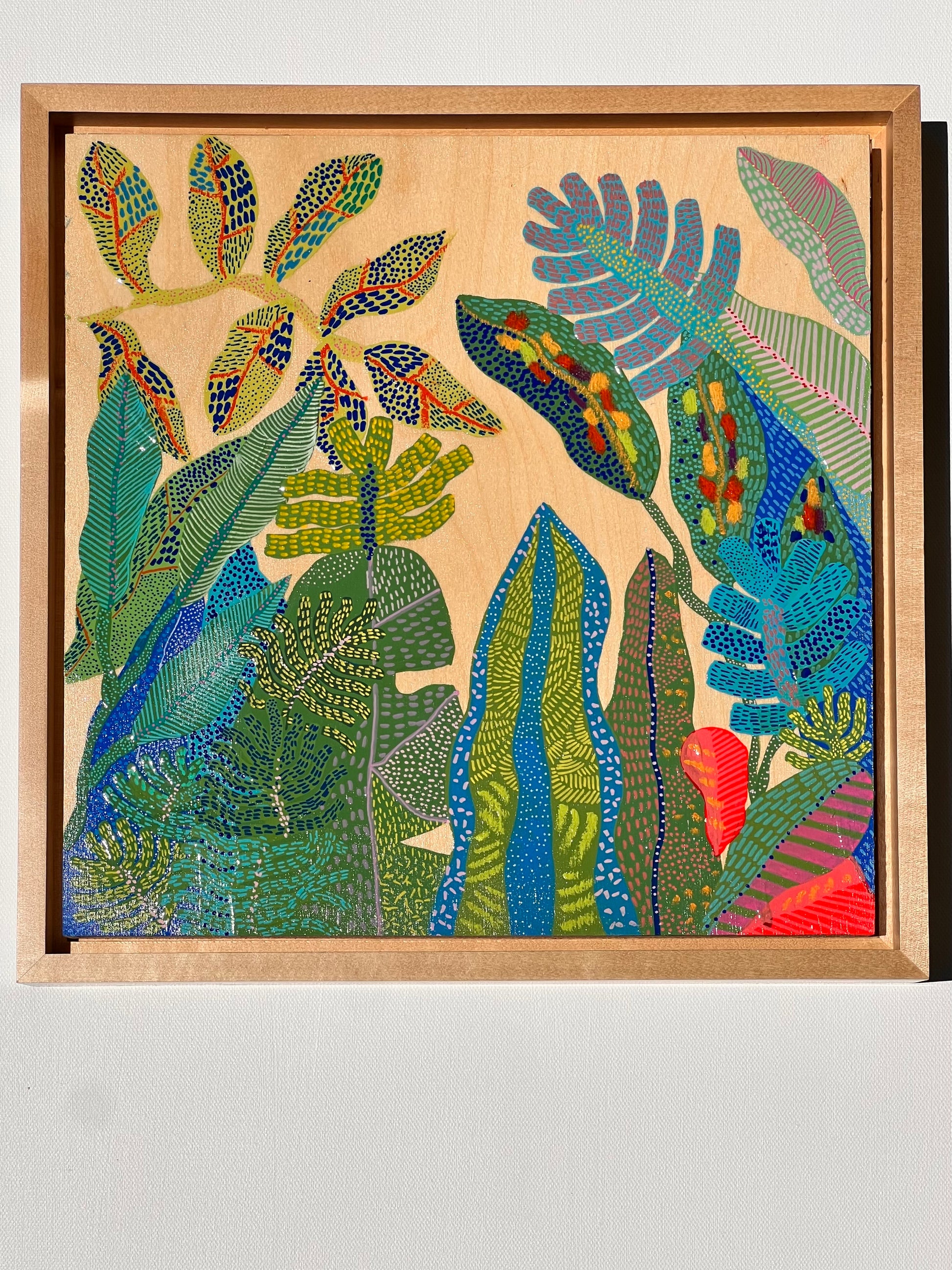 Let your walls speak the language of the jungle with “Tropical Language,” an original 12x12 inch mixed media painting on wood panel. This richly detailed piece celebrates the diversity and rhythm of tropical flora, rendered in intricate brushstrokes and joyful textures across a warm natural wood surface.