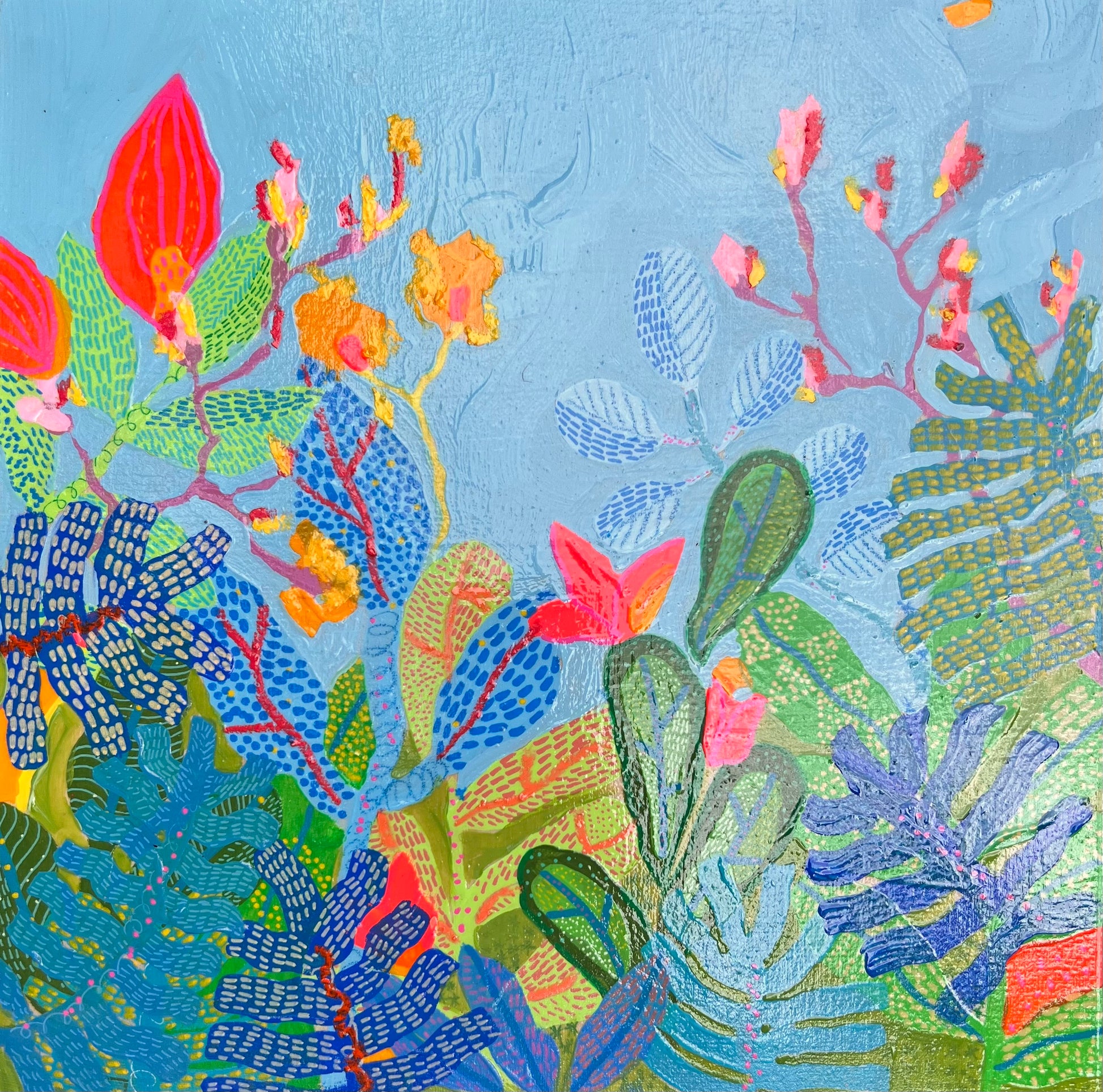 Step into a world of bold color and lush textures with Tropical Radiance, a one-of-a-kind original mixed media artwork on wood panel. Vivid red petals and golden blooms emerge from a vibrant jungle of cobalt, emerald, and lime-green leaves, all layered over a serene sky-blue background. Every detail—from the patterned leaves to the rhythmic brushstrokes—invites you to lose yourself in the richness of nature reimagined.