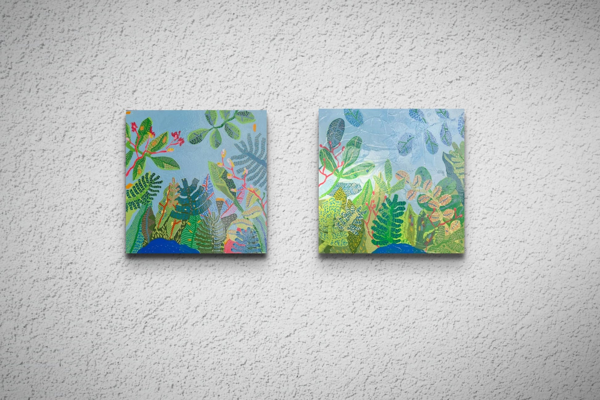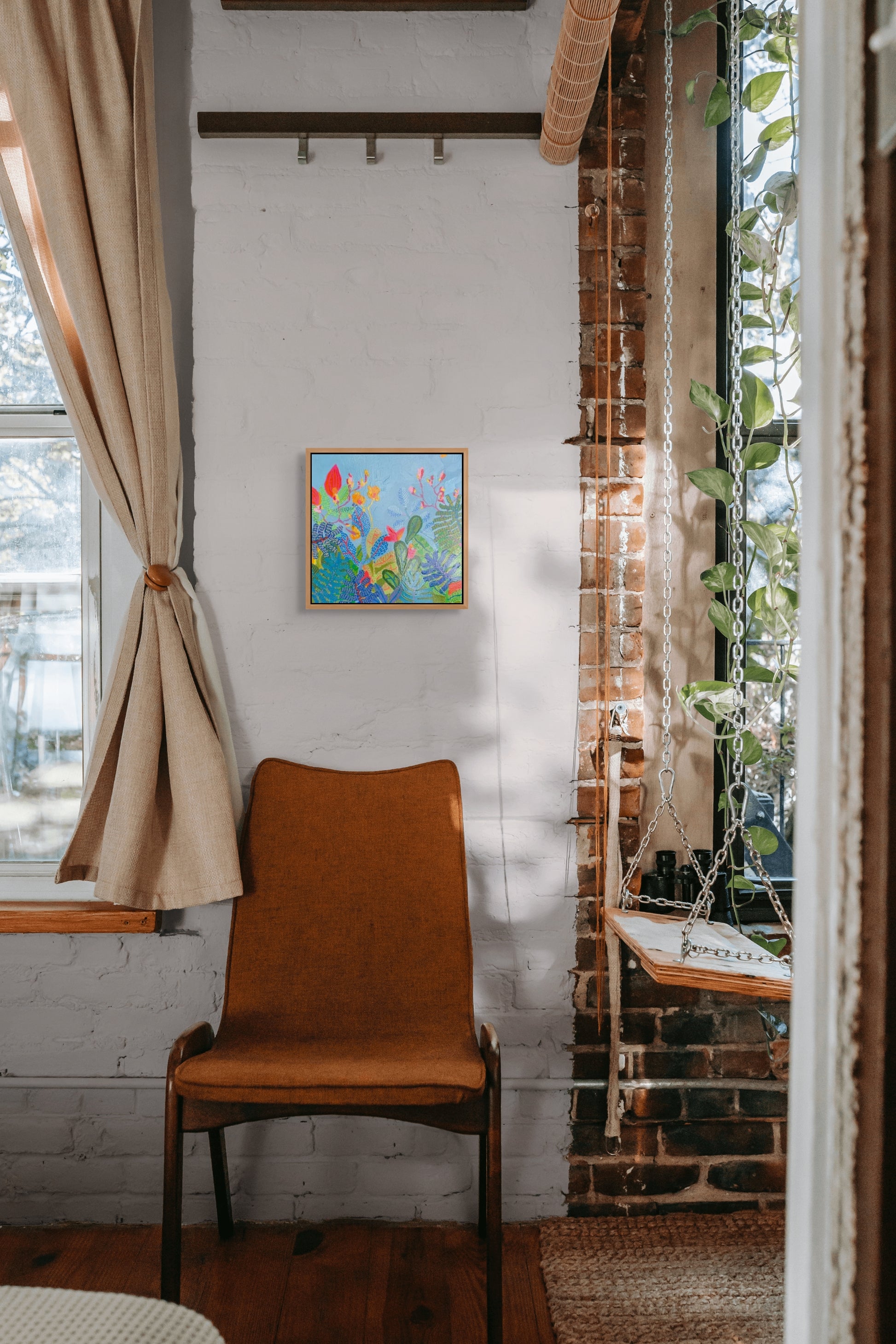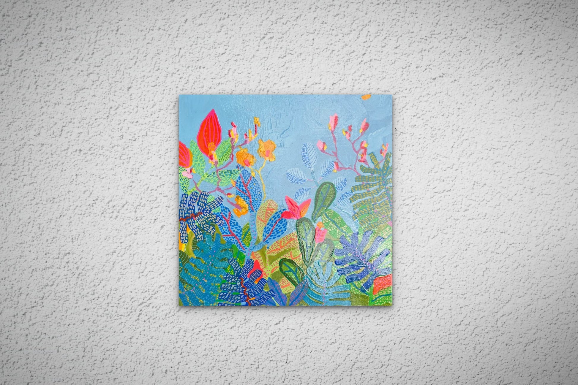 Created on a sturdy 12x12 wood panel, this piece requires no frame, making it ready to hang and enjoy right away. Its textured surface and vibrant palette make it not only a visual delight but also a tactile experience, bringing the energy of a tropical garden indoors.